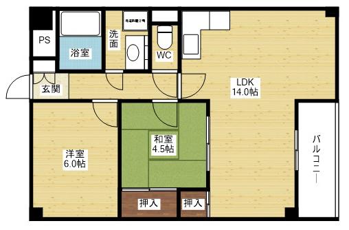| 間取り詳細 | 洋室 6畳 、和室 4.5畳 、LDK 14畳 |