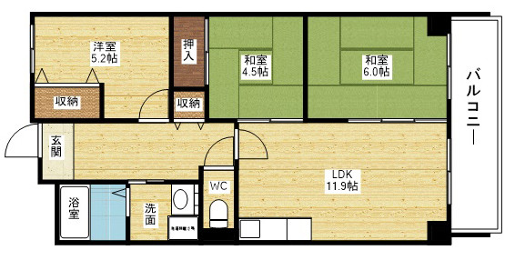 | 間取り詳細 | 洋室 5.2畳 、和室 6畳 、和室 4.6畳 、LDK 11.9畳 |